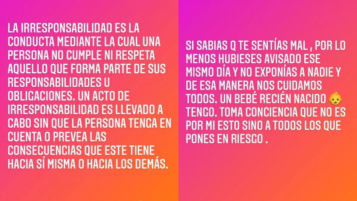 “La irresponsabilidad es la conducta mediante la cual una persona no cumple ni respeta aquello que forma parte de sus responsabilidades u obligaciones”, arrojó la pareja de Fabián Cubero en su cuenta de Instagram.