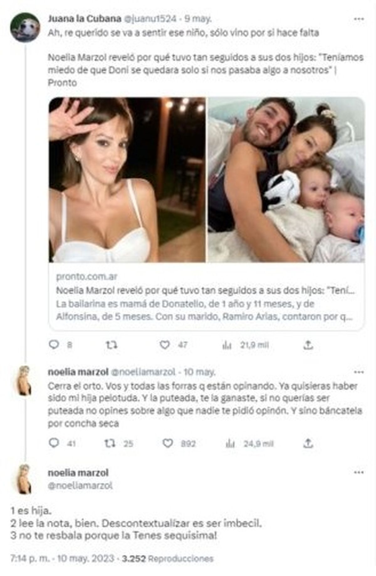 En la red social del pajarito, la usuaria citó una nota de Pronto que titulaba "Noelia Marzol reveló por qué tuvo tan seguidos a sus dos hijos: 'Teníamos miedo de que Doni se quedara solo si nos pasaba algo a nosotros'" y comentó "Ah, re querido se va a sentir ese niño, sólo vino por si hace falta".