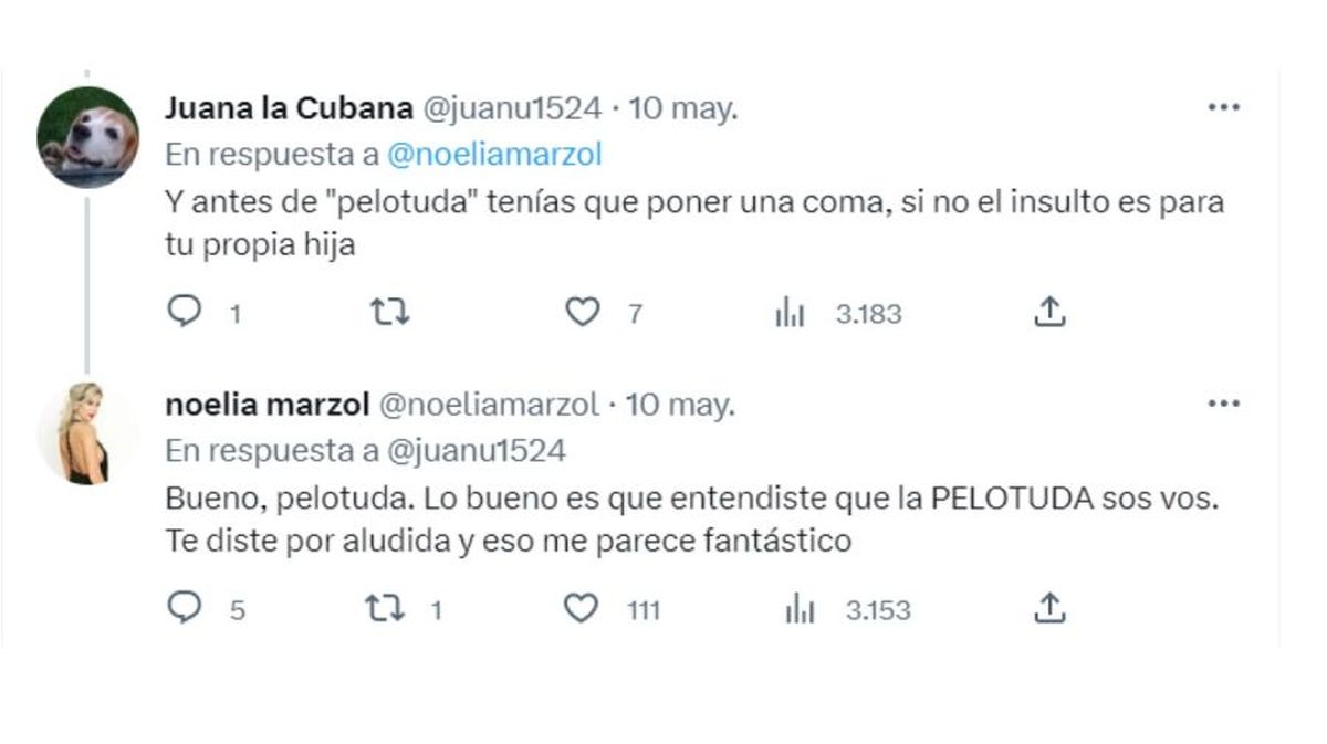 Ante semejante respuesta, la tuitera no se amedrentó y le respondió corrigiéndole la redacción a Marzol en tono sarcástico: "Y antes de 'pelotud...' tenías que poner una coma, si no el insulto es para tu propia hija". Pero lejos de quedar ahí la cosa, la bailarina de Sex volvió a la carga y le respondió una vez más.