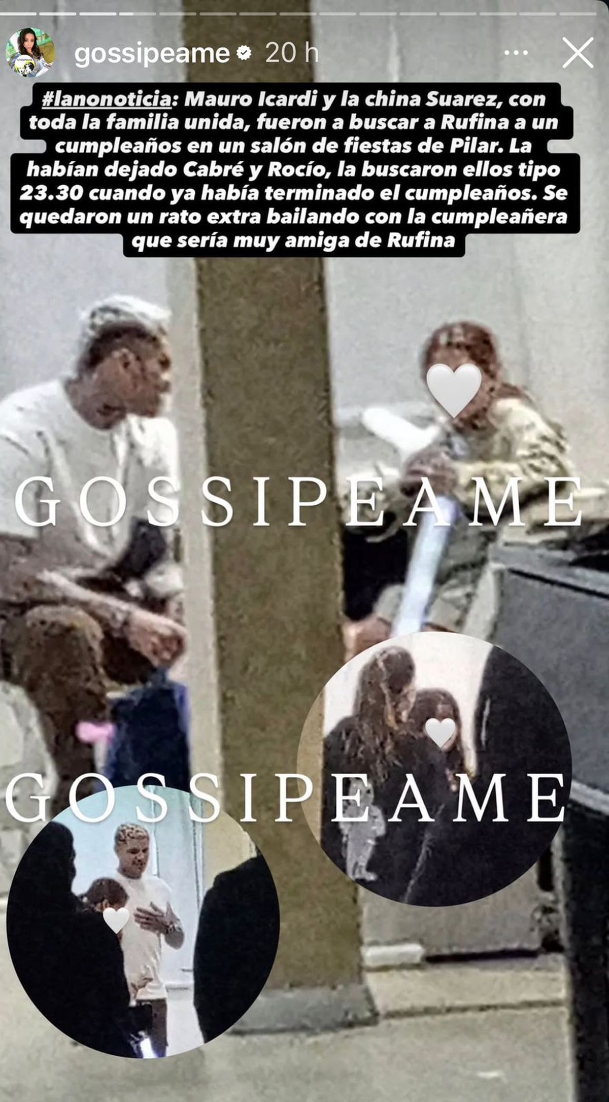 No fue otra que Pochi de Gossipeame, histórica amiga de Wanda desde el estallido del Wandagate, quien a través de sus Instagram Stories expuso una curiosa grabación de la feliz pareja junto a sus respectivos hijos. “Mauro Icardi y la China Suarez, con toda la familia unida, fueron a buscar a Rufina a un cumpleaños en un salón de fiestas de Pilar”, detalló la instagramer.
