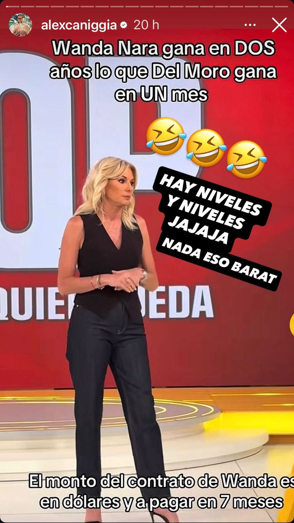 Lo cierto es que ese dato no pasó desapercibido para Alex Caniggia, quien una vez más se mofó de Wanda a través de sus Instagram Stories. Allí, el hermano de Charlotte Caniggia compartió una imagen de Yanina Latorre con sus declaraciones, al que se sumó su picante chicana junto a tres emojis a pura risa: “Hay niveles y niveles jajaja. Nada, eso, Barat”.