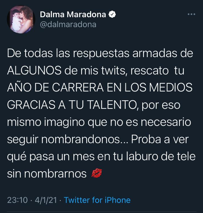 "De todas las respuestas armadas de algunos de mis tweets, rescato tu año de carrera en los medios gracias a tu talento, por eso mismo imagino que no es necesario seguir nombrándonos. Probá a ver qué pasa un mes en tu laburo de tele sin nombrarnos", escribió Dalma y cerró con un emoji de un beso.