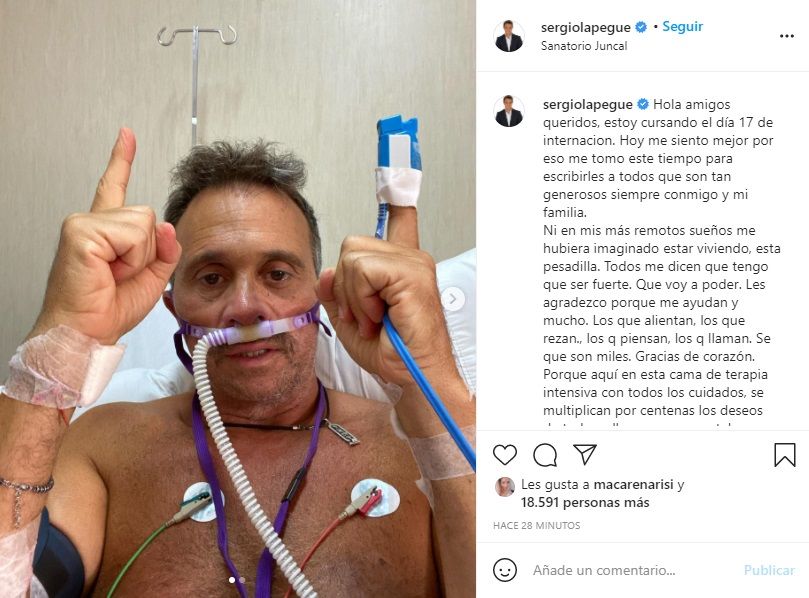"El optimista por naturaleza a veces no puede serlo siempre. Y lo admito. La vida acá es así. No puedo bajar. No puedo hacer movimientos bruscos simplemente porque mis pulmones lo pueden sentir. Y ahora están dominados y manejados por el COVID. Solo por ahora. Si, el tiene el control, pero yo tengo el control de mi mente. Es una pelea fuerte en medio del ring. El que logra respirar gana. El que sabe esquivar los golpes a la larga termina venciendo. Por eso esté mi mensaje a todos los amigos que preguntan y que por obvias razones no puedo responder", amplió Sergio.