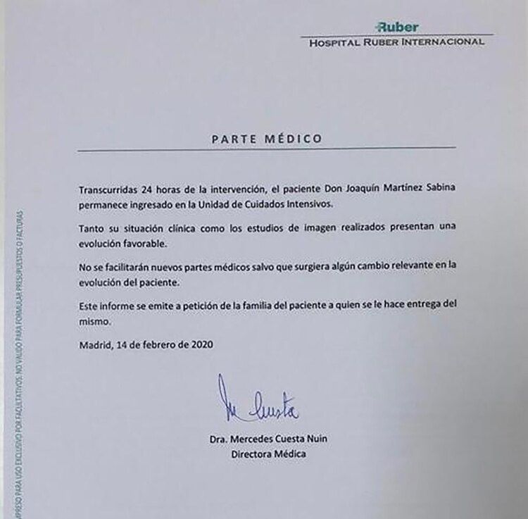 "Transcurridas 24 horas de la intervención, el paciente Don Joaquín Martínez Sabina permanece ingresado en la Unidad de Cuidados Intensivos", indicó el escrito difundido este viernes.