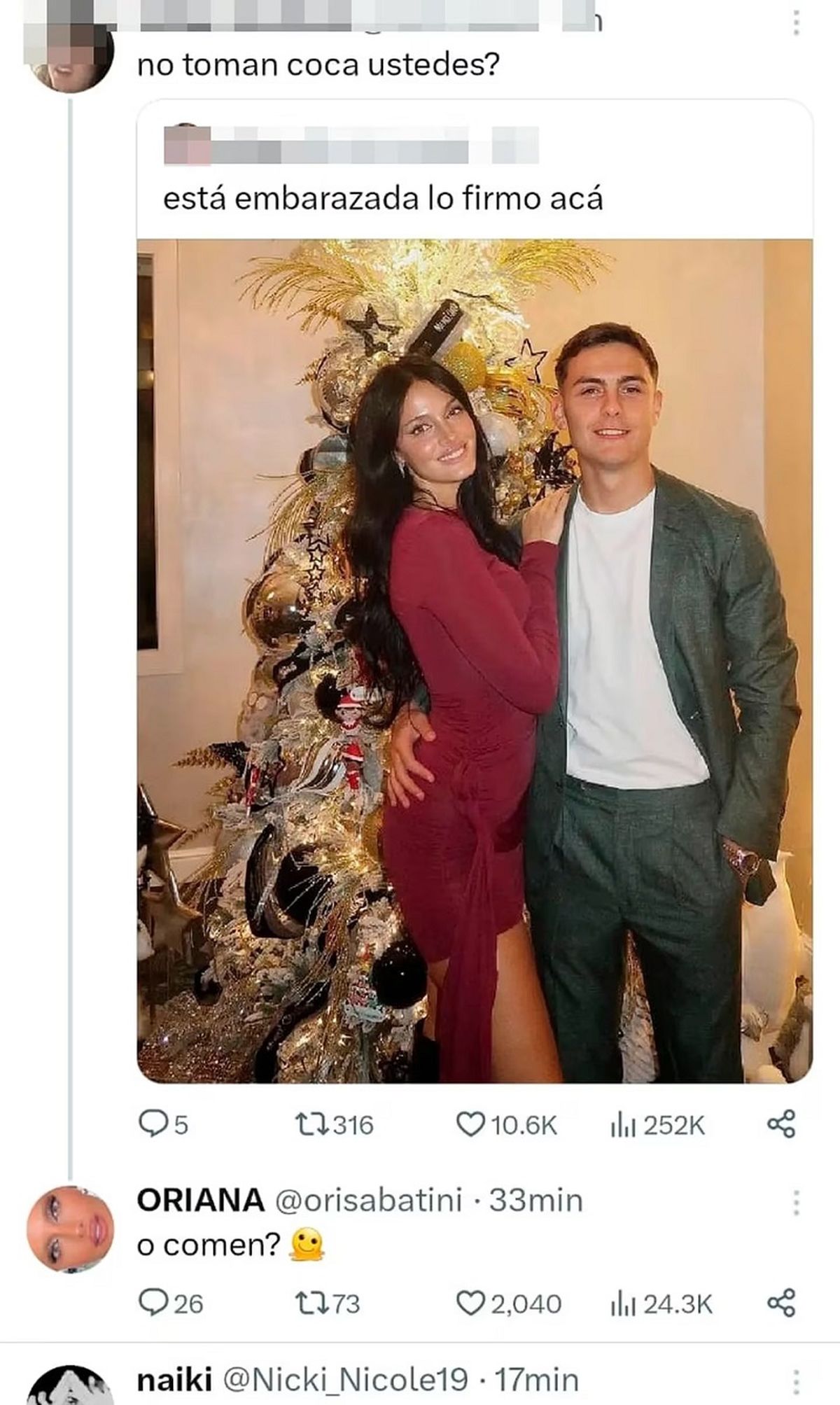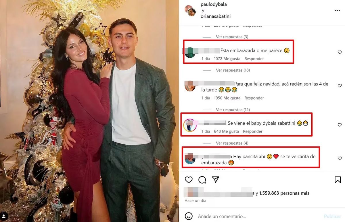“Vi rápido la foto y pensé que Ori estaba embarazada. Casi me emocioné”, “‘Me gusta’ si vos pensaste que Ori está embarazada”, “¿Está embarazada o me parece?”, “Se viene baby Dybala Sabatini” y “Hay pancita ahí. Se te ve carita de embarazada”, fueron algunos de los muchos comentarios que les dejaron en la publicación virtual.