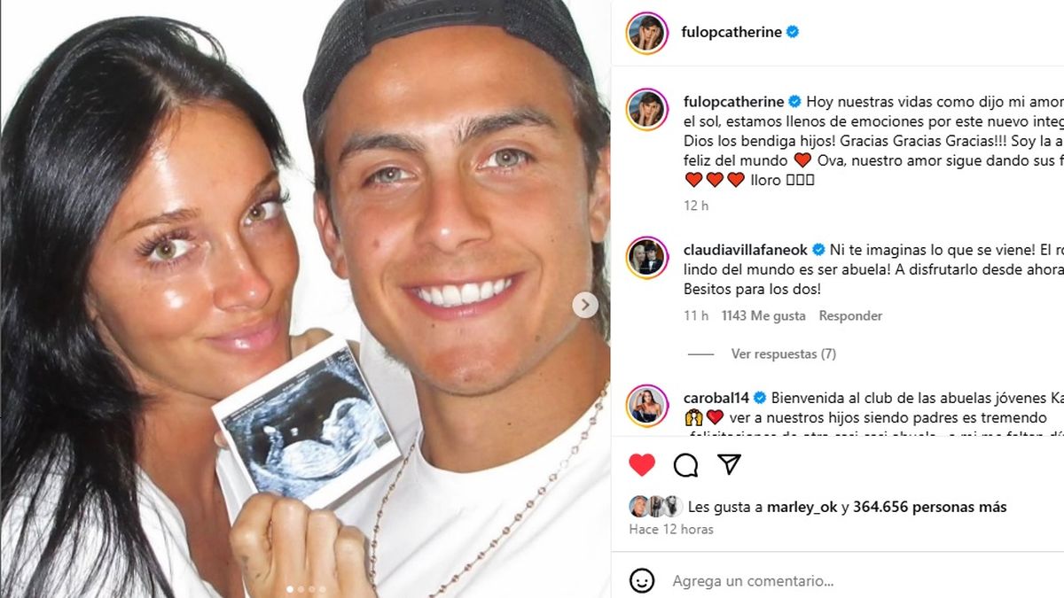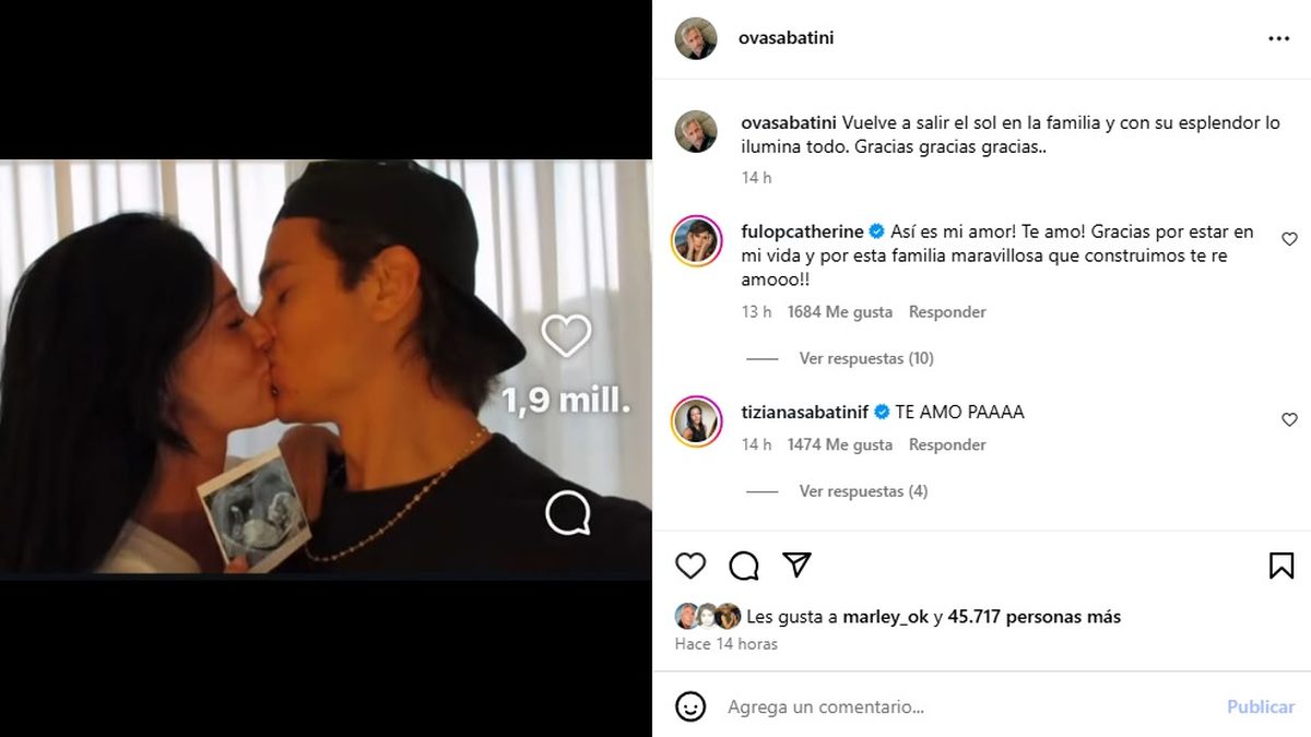Entre los más conmovidos estuvieron, como era de esperar, los futuros abuelos Catherine Fulop y Osvaldo “Ova” Sabatini. El hermano de Gabriela fue quien dio el puntapié inicial en Instagram, al publicar una romántica postal de los flamantes futuros papás besándose mientras sostenían la ecografía. Junto a la foto, escribió un emotivo mensaje: “Vuelve a salir el sol en la familia y con su esplendor ilumina todo. Gracias, gracias, gracias”.