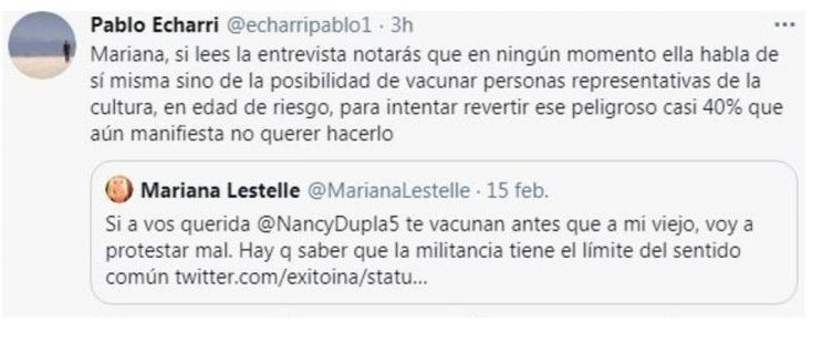 Al leer la nota, la doctora Mariana Lestelle no coincidió y estalló: "Si a vos querida te vacunan antes que a mi viejo, voy a protestar mal". Dupláa le respondió de manera amable. "Leé la nota querida Mariana... Toda mi admiración para vos y tu trabajo. Abrazo", le escribió.