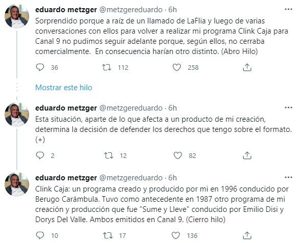 "Sorprendido porque a raíz de un llamado de LaFlia y luego de varias conversaciones con ellos para volver a realizar mi programa Clink Caja para Canal 9 no pudimos seguir adelante porque, según ellos, no cerraba comercialmente. En consecuencia harían otro distinto", comenzó Eduardo.