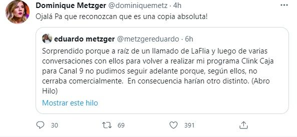 Por su parte, Dominique Metzger, conductora de TN, bancó a su papá: "Ojalá pa que reconozcan que es una copia absoluta!".