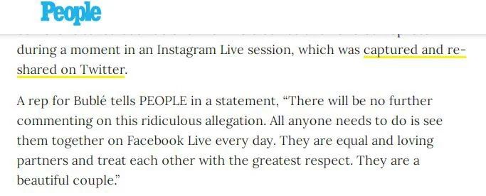 Más allá de las explicaciones de la actriz, el tema se fue instalando en la agenda de los medios de todo el mundo y la revista People habló con uno de los representantes de Bublé.