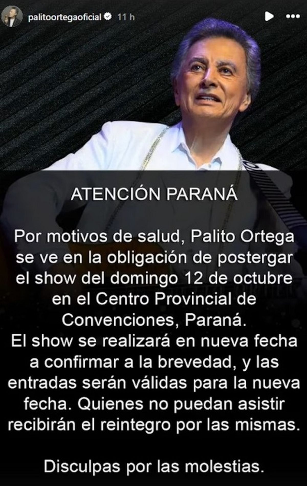 "Por motivos de salud, Palito Ortega se ve en la obligación de postergar el show del domingo 12 de octubre en el Centro Provincial de Convenciones, Paraná", se indicó desde su cuenta en Instagram.
