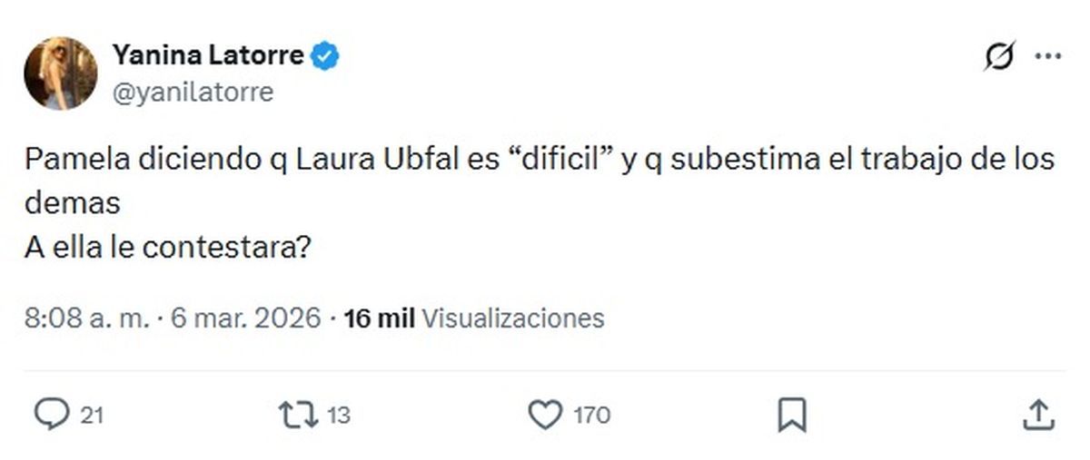 Mientras el tema se desarrollaba en el programa, Yanina Latorre siguió la conversación desde sus redes sociales y publicó un mensaje que rápidamente llamó la atención.“Pamela diciendo que Laura Ubfal es ‘difícil’ y que subestima el trabajo de los demás. ¿A ella le contestará?”, escribió la panelista y conductora de SQP, sumándose así al debate.
