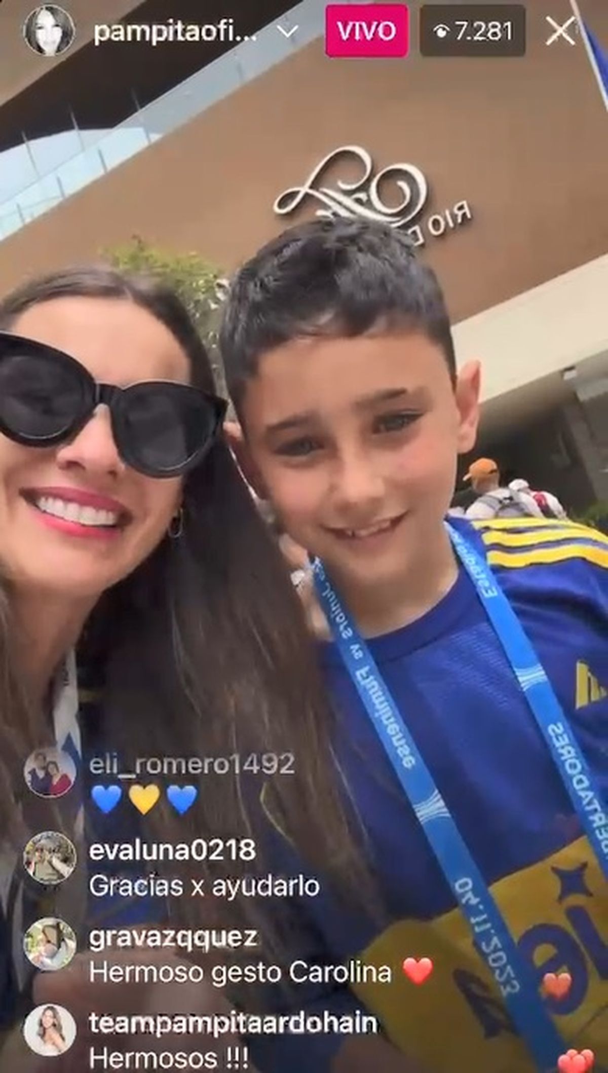 Junto a su hijo Beltrán, Pampita viajó a Río de Janeiro para regalarle las entradas de la final de la Copa Libertadores al nene que había rifado su consola de video para llegar al país carioca para acompañar al equipo de sus amores. El video.