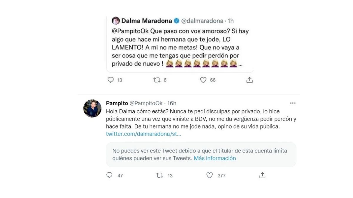 Al ver esta reacción del panelista al aire, Dalma Maradona le escribió directamente a Pampito vía Twitter: "¿Qué pasó con vos amoroso? Si hay algo que hace mi hermana que te jode, lo lamento, a mí no me metas... Que no vaya a ser cosa que me tengas que pedir perdón por privado de nuevo", le dijo Dalma picante al periodista.