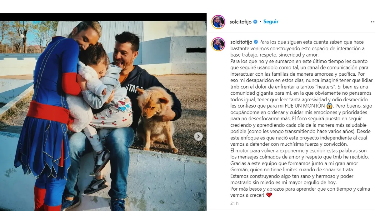"Pero bueno, sigo ocupándome en ordenar y cuidar mis emociones y prioridades para no desenfocarme más. El foco seguirá puesto en seguir creciendo y aprendiendo cada día de la manera más saludable posible (como les vengo transmitiendo hace varios años). Desde este enfoque es que nació este proyecto independiente al cual vamos a defender con muchísima fuerza y convicción. El motor para volver a exponerme y escribir estas palabras son los mensajes colmados de amor y respeto que también he recibido", argumentó Sol.