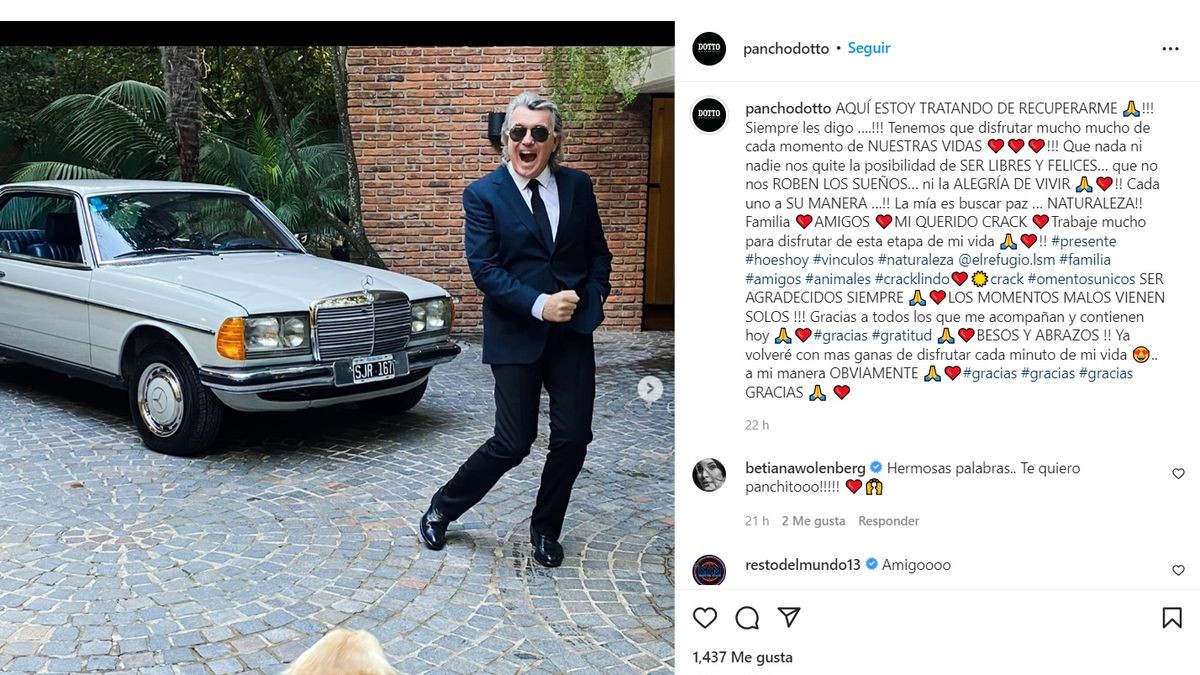 En su cuenta de Instagram, Pancho Dotto compartió un movilizante posteo tras dar positivo al test de coronavirus: "Aquí estoy tratando de recupararme! Siempre les digo que tenemos que disfrutar mucho mucho de cada momento de nuestras vidas. Que nada ni nadie nos quite la posibilidad de ser libres y felices, que no nos roben los sueños ni la alegría de vivir", indicó.