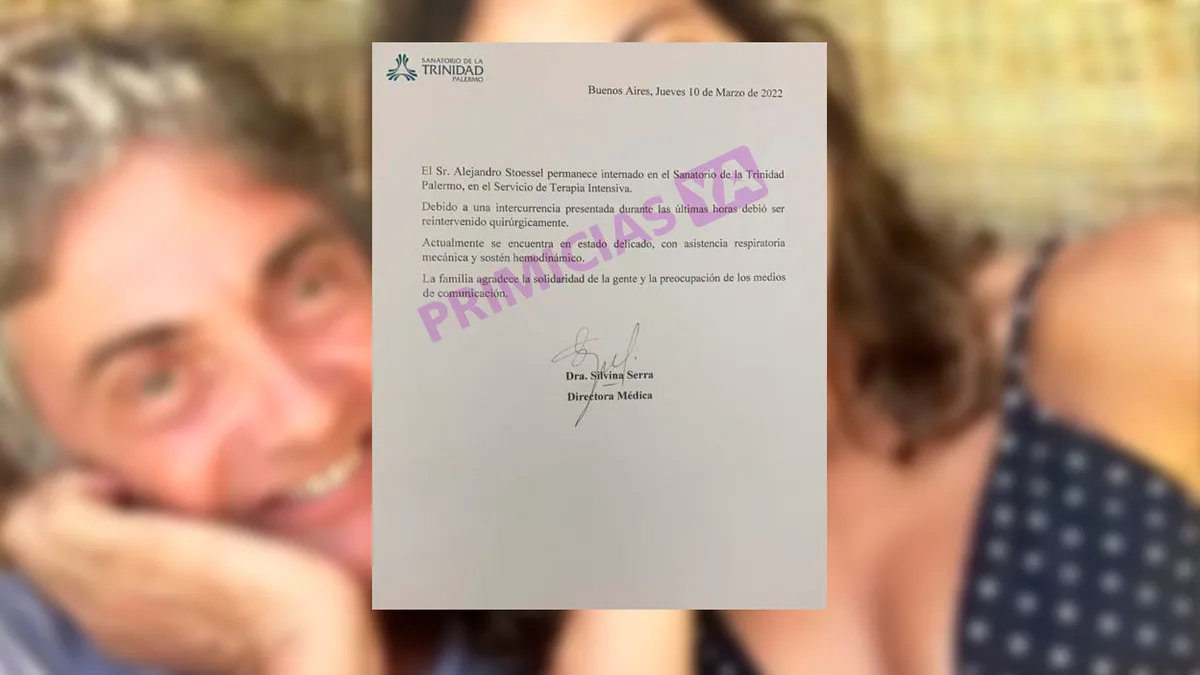 "El Sr. Alejandro Stoessel permanece internado en el Sanatorio de la Trinidad, en el Servicio de Terapia Intensiva. Debido a una intercurrencia presentada durante las últimas horas debió ser reintervenido quirúrgicamente", comienza diciendo el parte médico.