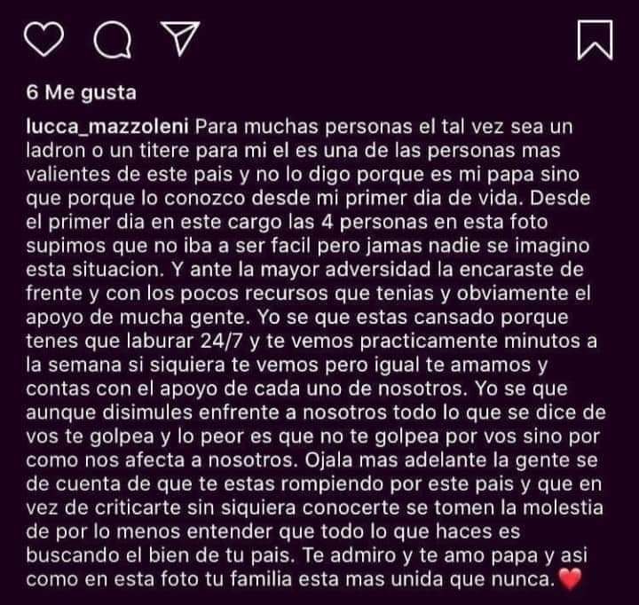 "Para muchas personas tal vez sea un ladrón o un títere. Para mí, él es una de las personas más valientes de este país y no lo digo porque es mi papá sino porque lo conozco desde mi primer día de vida", inicia la dedicatoria de Lucca Mazzoleni.