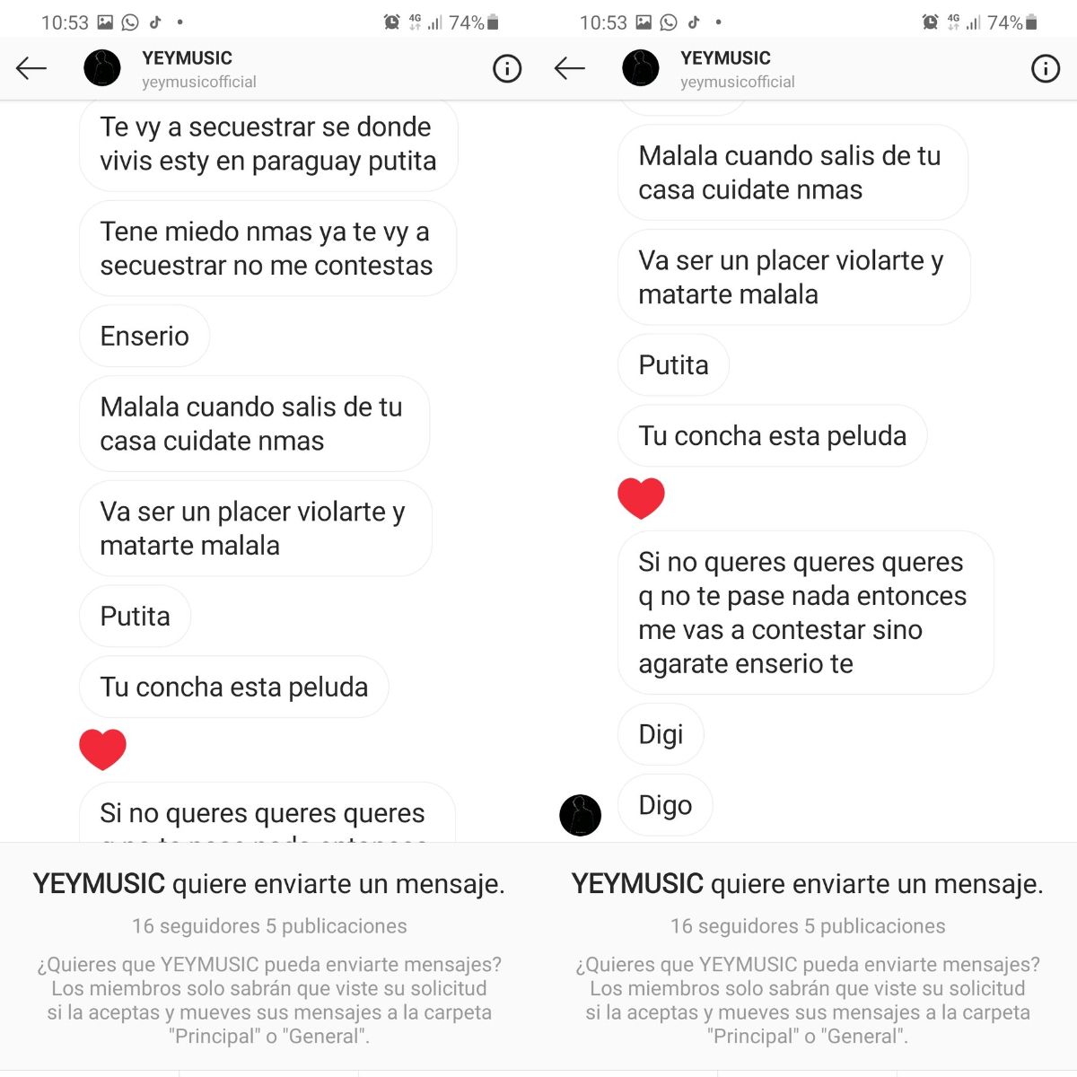 "Te voy a secuestrar, se donde vivís...", "Malala cuando salís de tu casa cuidate..", "Va a ser un placer violarte y matarte..." son algunas de las palabras que escribe el usuario de Instagram en el mensaje.