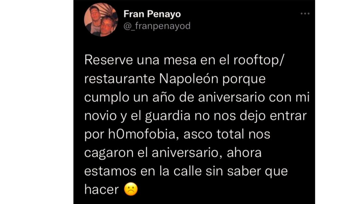 Un día, que iba a ser solo celebración, casi termina mal. El usuario de Twitter (@_franpenayod) Fran Penayo denunció en sus redes que reservó una mesa para compartir con su novio, en un conocido restaurante en Asunción para celebrar el Día de los Enamorados, el pasado 14 de febrero.