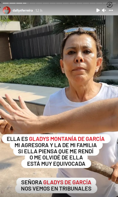 “Ella es Gladys Montanía de García, mi agresora y la de mi familia. Si ella piensa que me rendí o me olvidé de ella, está muy equivocada. Señora Gladys de García nos vemos en Tribunales”, advirtió en su historia de Instagram.