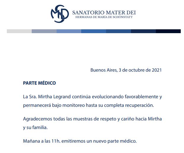 El Sanatorio Mater Dei de la Ciudad Autónoma de Buenos Aires difundió hoy domingo 3 de octubre de 2021 un un nuevo parte médico sobre la salud de la actriz y conductora Mirtha Legrand, internada en ese lugar desde el pasado jueves.