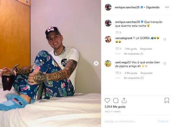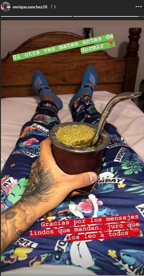 Luego de que la joven confirmara su alejamiento, Sánchez publicó un particular mensaje en su cuenta de Instagram. “Qué tranquilo que duermo esta noche”, escribió Enrique, quien se retrató a pura sonrisa, tomando mate en la cama.