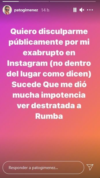 "Quiero disculparme públicamente por mi exabrupto en Instagram (no dentro del lugar como dicen). Sucede que me dio mucha impotencia ver destratada a Rumba", precisó desde sus historias.