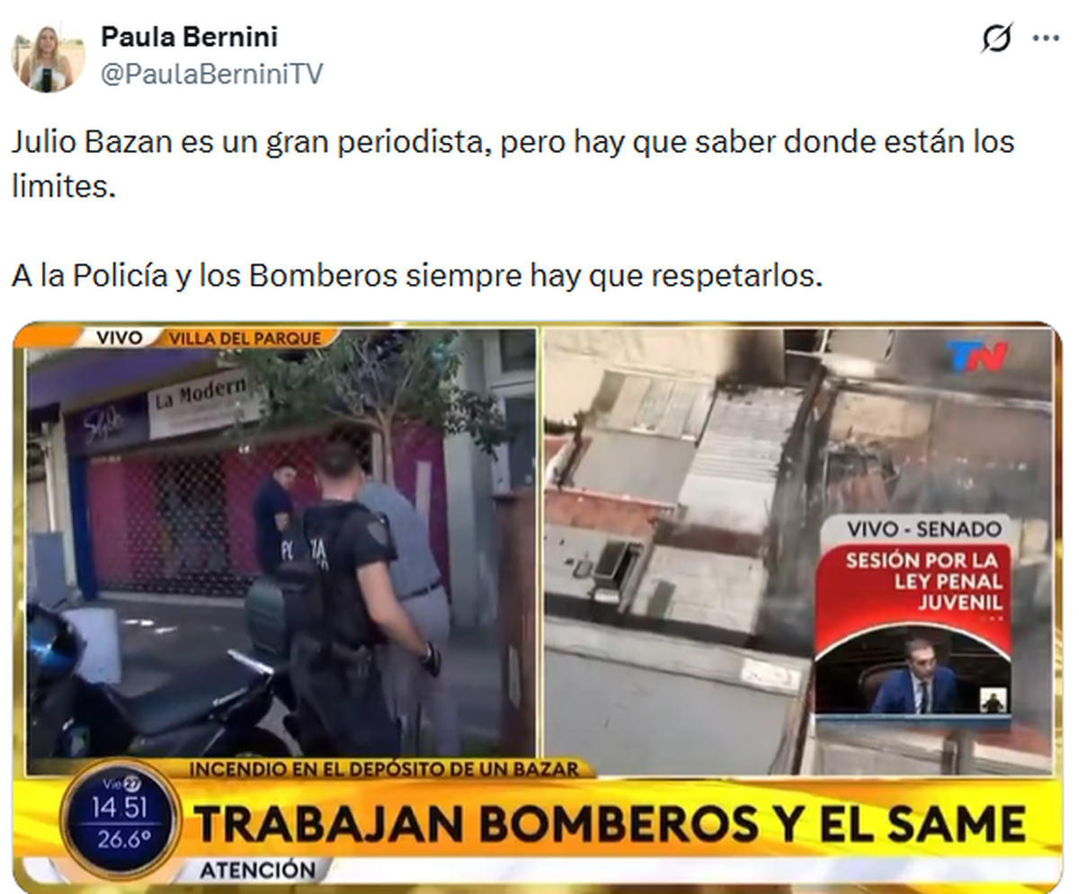A la periodista Paula Bernini no le cayó nada bien la actitud de su colega, Julio Bazán, durante un operativo. Molesta por lo que consideró una conducta inapropiada, decidió manifestar su postura y salió a cruzarlo públicamente a través de sus redes sociales.