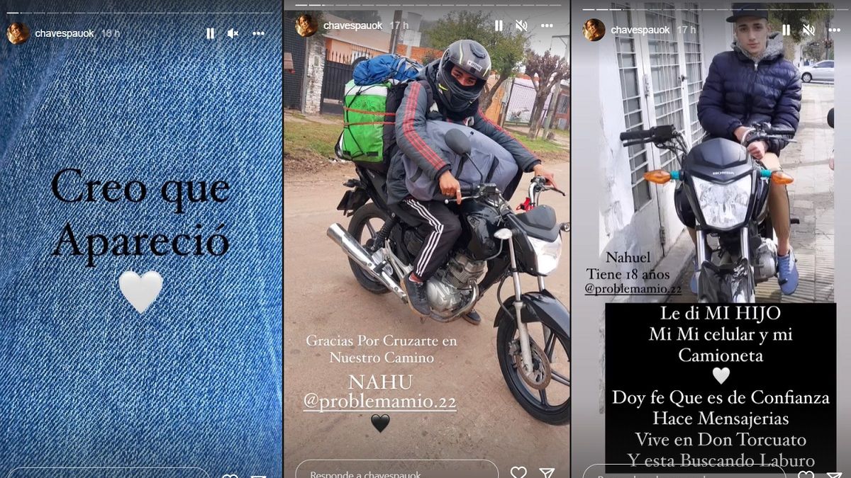"Creo que apareció. Gracias por cruzarte en nuestro camino Nahu. Nahuel tiene 18 años, le di a mi hijo y mi camioneta. Doy fe que es de confianza, hace mensajerías, vive en Don Torcuato y está buscando laburo", indicó la esposa de Pedro Alfonso muy agradecida con el joven y remarcando que es de absoluta confianza.