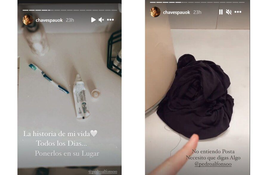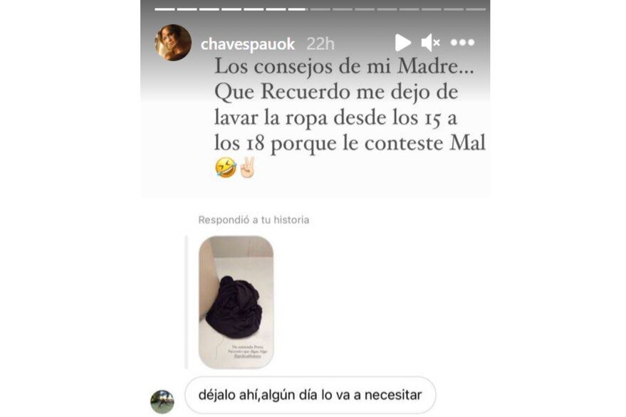 Chaves también compartió una imagen de la ropa sucia de su pareja, abandonada en el suelo después de la ducha. “El tacho de la ropa sucia y la ropa”, dijo.