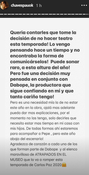“Pero es una necesidad mía la de no estar este año en la obra, ojalá más adelante pueda das más explicaciones, por el momento no las tengo, solo decirles que necesito estar más tiempo en casa con mis hijos. De todas formas, ahí estaremos para acompañar a Pepe, pero este año abajo del escenario”, añade la conductora de Bake Off, Telefe.