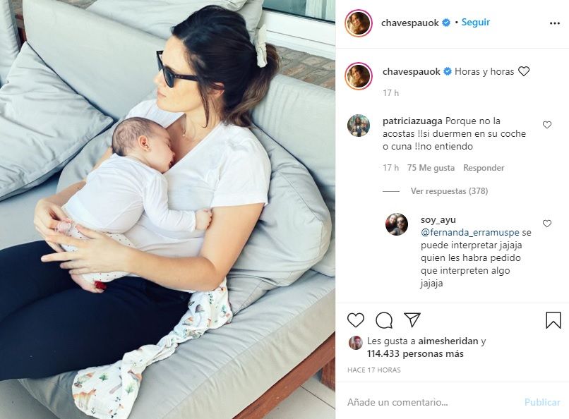 Embed -Paula Chaves- "Horas y horas", expresó Chaves en el posteo donde se la ve en una tierna imagen con su hija durmiendo sobre ella.