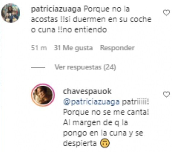 LEER MÁS: Paula Chaves cuestionó la labor de los obstetras y habló del concepto de "violencia obstétrica" Embed -Paula Chaves- Este comentario se llenó de respuestas, entre las que se sumó la propia Paula, madre también de Olivia y Baltazar, fruto de amor con Pedro Alfonso."Patri, ¡porque no se me canta! Al margen de que si la pongo en la cuna se despierta...", sentenció la conductora.LEER MÁS: Paula Chaves festejó su cumpleaños de manera virtual: "Distinto pero lleno de amor" Embed -Paula Chaves-
