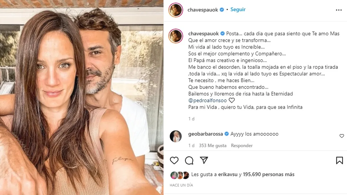 Desde Instagram, Paula sorprendió a Pedro con un romántico posteo donde deja en claro lo importante que es su marido para su vida. "Posta… cada día que pasa siento que te amo más, que el amor crece y se transforma… Mi vida al lado tuyo es Increíble…", comenzó su emotivo mensaje la modelo y conductora.