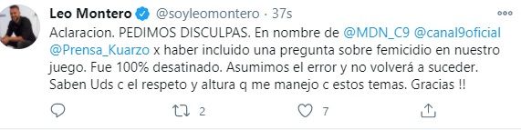 "Aclaración. PEDIMOS DISCULPAS. En nombre de @MDN_C9 @canal9oficial @Prensa_Kuarzo x haber incluido una pregunta sobre femicidio en nuestro juego. Fue 100% desatinado. Asumimos el error y no volverá a suceder. Saben Uds con el respeto y altura que me manejo con estos temas. Gracias!!", expresó Leo.