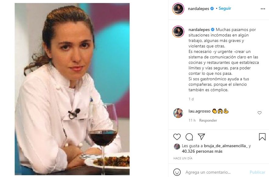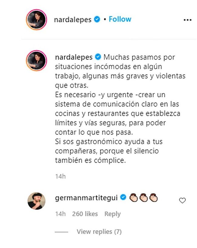 "Si sos gastronómico ayuda a tus compañeras, porque el silencio también es cómplice", finalizó Lepes, quien recibió el aplauso de su colega Germán Martitegui en la publicación.