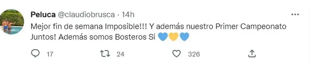 "Mejor fin de semana Imposible!!! Y además nuestro primer campeonato Juntos! Además somos Bosteros Sí", expresó feliz Peluca en la red social del pajarito.