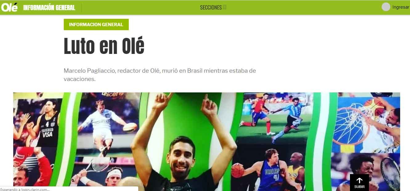 Una triste noticia invadió la redacción del diario deportivo Olé este miércoles cuando llegó la información de que murió ahogado Marcelo Pagliaccio, un periodista de 32 años que vacacionaba en Florianópolis junto a sus amigos.