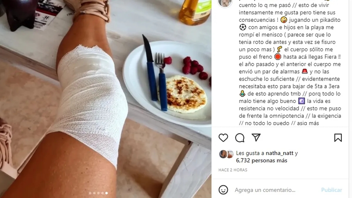 Y siguió su posteo: "Jugando un pikadito con amigos e hijos en la playa me rompí el menisco (parece ser que lo tenia roto de antes y esta vez se fisuró un poco más) el cuerpo sólito me puso el freno hasta acá llegas fiera el año pasado y el anterior el cuerpo me envió un par de alarmas y no las escuché lo suficiente".