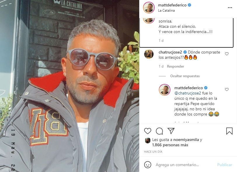 Ahí, el ex futbolista José Chatruc le comentó la publicación: "Dónde compraste los anteojos?", le consultó. A lo que Matías contestó picante: "Fue lo único que me quedó en la repartija Pepe querido jajajaja, no bro ni idea donde los compré".