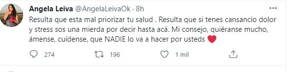 Luego, desde Twitter, Angela afirmó contundente: "Resulta que está mal priorizar tu salud . Resulta que si tenes cansancio dolor y stress sos una mierda por decir hasta acá. Mi consejo, quiéranse mucho, ámense, cuídense, que NADIE lo va a hacer por ustedes".