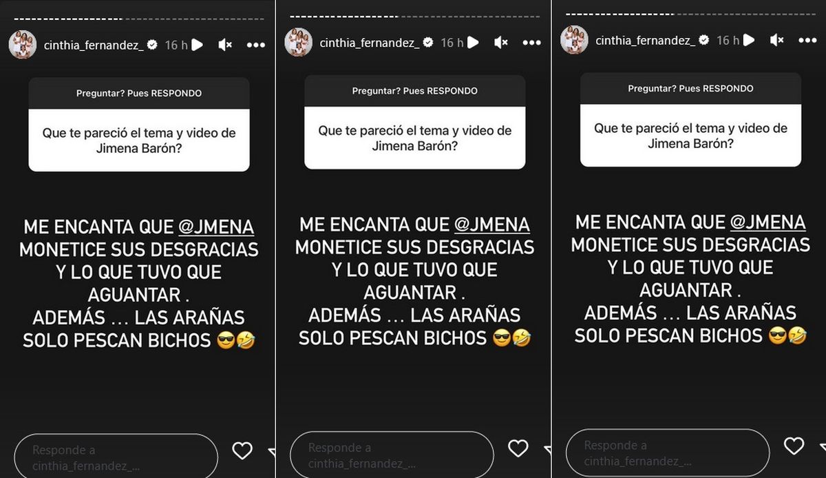 "¿Qué te pareció el tema y video de Jimena Barón?", le consultaron a Cinthia desde sus historias. Y la panelista comentó pícara: "Me encanta que Jimena monetice sus desgracias y lo que tuvo que aguantar. Además, las arañas solo pescan bichos".