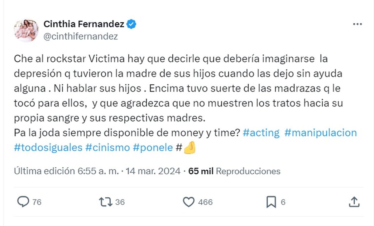 "Che al rockstar Victima hay que decirle que debería imaginarse la depresión que tuvieron la madre de sus hijos cuando las dejó sin ayuda alguna. Ni hablar sus hijos", lanzó picante.