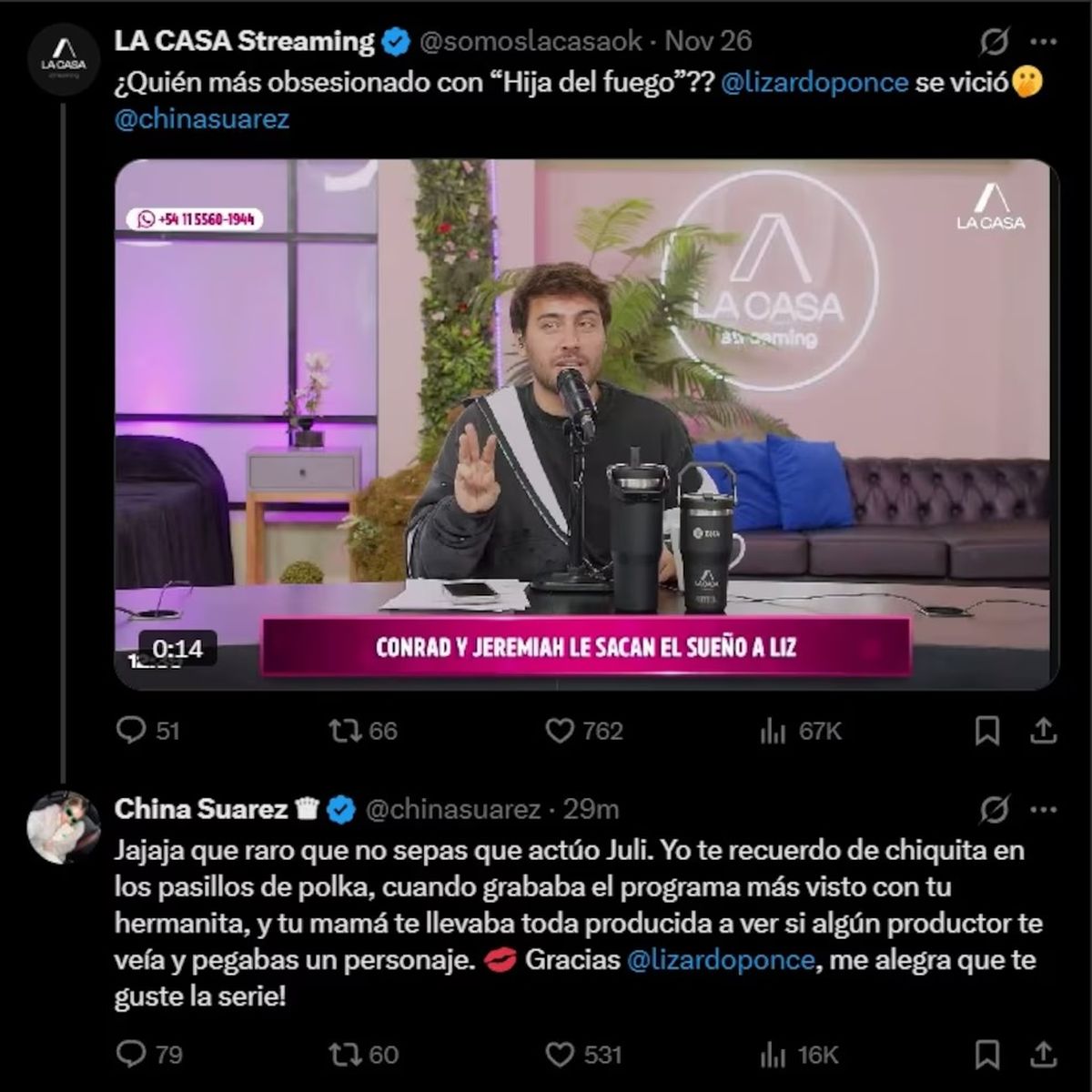 La respuesta de Suárez no pasó desapercibida. Cuando Poggio quiso saber en Rumis si la protagonista de Hija del fuego era la ex Casi Ángeles, la artista lanzó un mensaje cargado de dardos. "Jajaja, qué raro que no sepas que actúo, Juli. Yo te recuerdo de chiquita en los pasillos de Pol-ka, cuando grababa el programa más visto con tu hermanita, y tu mamá te llevaba toda producida a ver si algún productor te veía y pegabas un personaje. ¡Gracias @lizardoponce, me alegra que te guste la serie!", escribió la actriz, marcando su incomodidad con la consulta de Julieta.