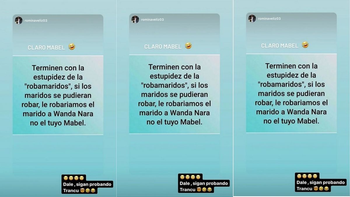“Terminen con la estupidez de la ‘robamaridos’. Si los maridos se pudieran robar, se lo robaríamos a Wanda Nara, no al tuyo, Mabel”, rezaba el posteo que publicó con un “claro, Mabel” y un emoji de una carita riéndose. Y además agregó picante abajo: “Dale, sigan probando trancu”.