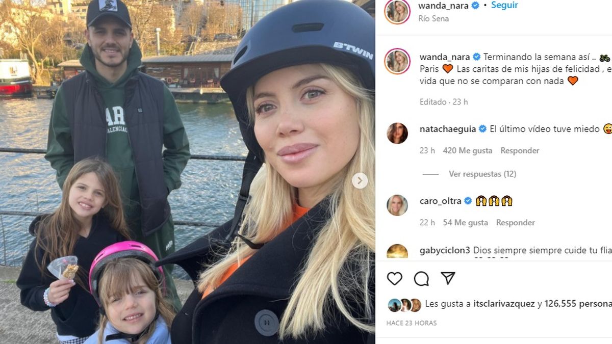 Wanda Nara decidió salir a pasear en bicicleta por las calles parisinas junto al futbolista Mauro Icardi, sus pequeñas Francesca e Isabella y también, su madre, Nora Colosimo.