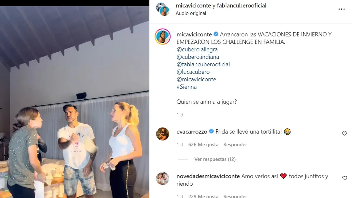 Hace unos días, Mica Viciconte y Fabián Cubero subieron a su cuenta de Instagram un video de un polémico challenge que se volvió muy popular en las redes pero que es un poco violento. Junto al ex futbolista de Vélez Sarsfield y su mujer están las tres hijas que tiene él con Nicole Neumann: Indiana, Allegra y Sienna.