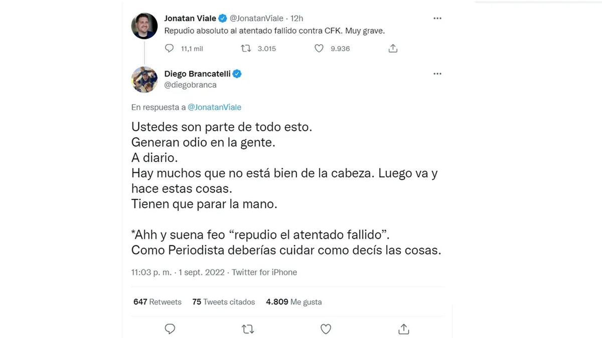 "Repudio absoluto al atentado fallido contra CFK. Muy grave", expresó el conductor de LN+. A lo que Brancatelli le contestó: "Ustedes son parte de todo esto. Generan odio en la gente. A diario. Hay muchos que no está bien de la cabeza. Luego va y hace estas cosas".