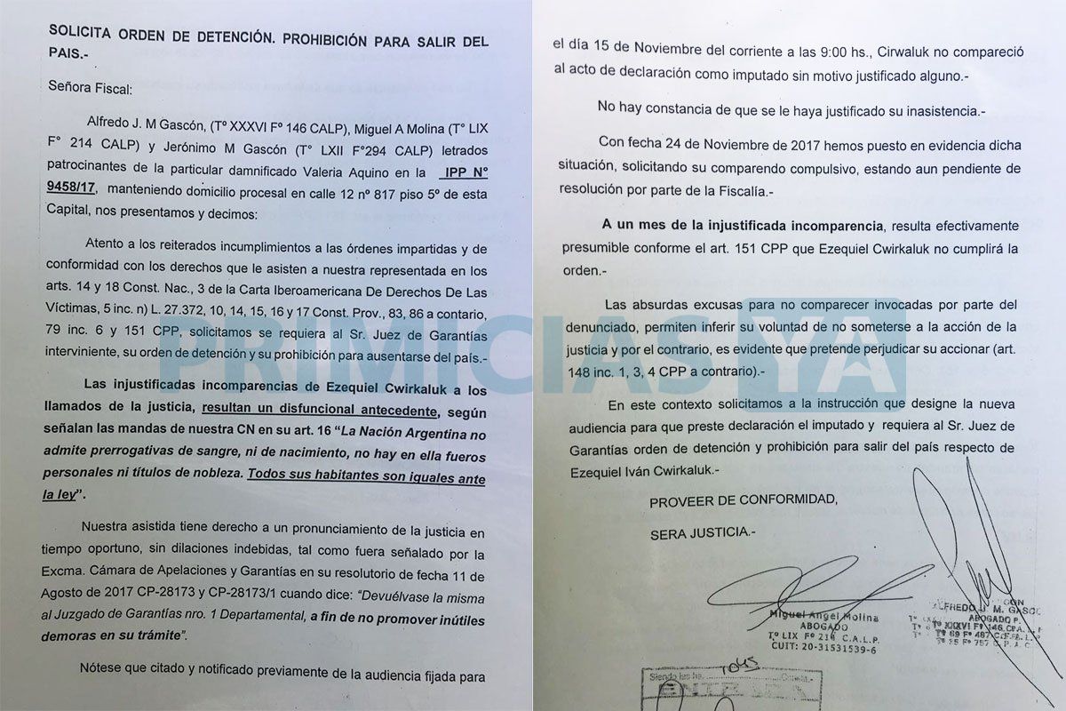 El pedido librado por los defensores de Aquino indica que "las absurdas excusas para no comparecer invocadas por parte del denunciado, permiten inferir su voluntad de no someterse a la acción de la Justicia y por el contrario, es evidente que pretende perjudicar su accionar"." En este contexto solicitamos a la instrucción que designe la nueva audiencia al imputado y requiera al Sr. Juez de Garantías orden de detención y prohibición para salir del país respecto de Ezequiel Ivan Cwikaluk", agrega.El cantante se encuentra ensayando por estos días para la obra " Explosivos", que se presentará en Carlos Paz. Se estima que la idea del artista y sus abogados es esperar a la feria judicial y poder debutar sin problemas en la temporada.